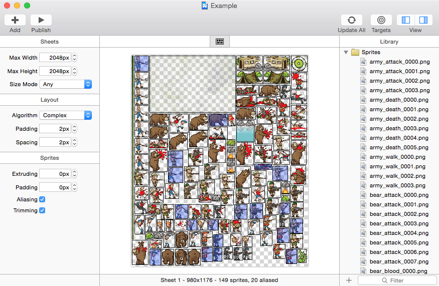 - Aliasing finds and merges identical sprites into the same spot in the sprite sheet.